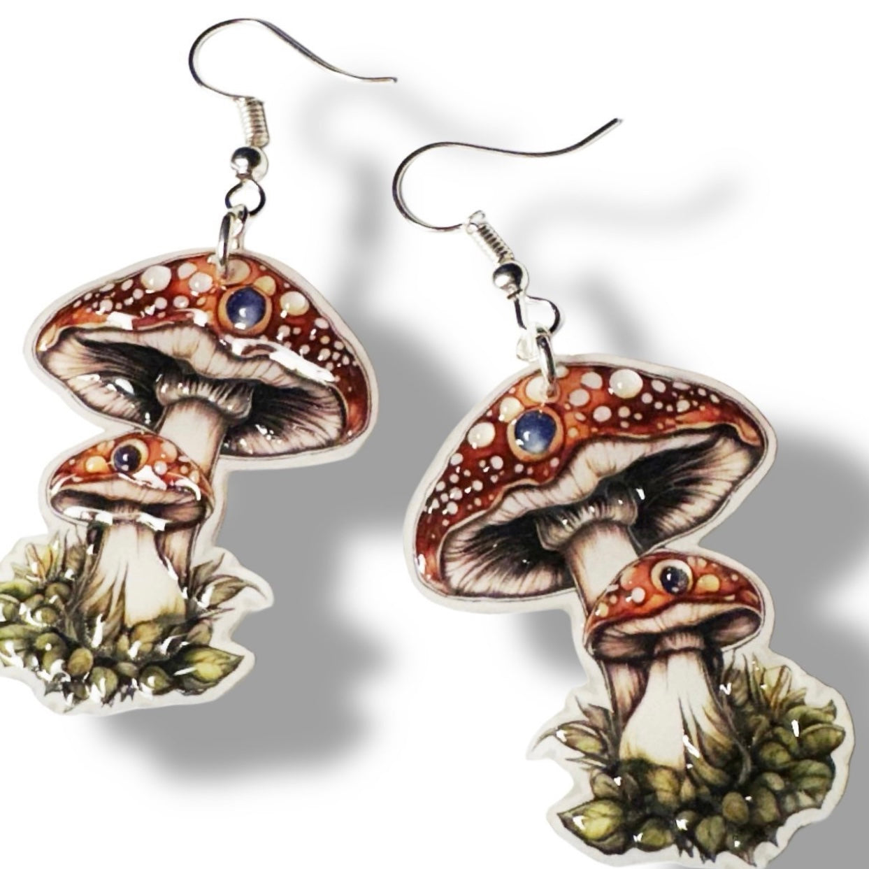 Handcrafted dangle earrings measure 2.5 inches in length. Earrings are made from plastic and sealed with a high-gloss finish. Featuring silver plated findings.