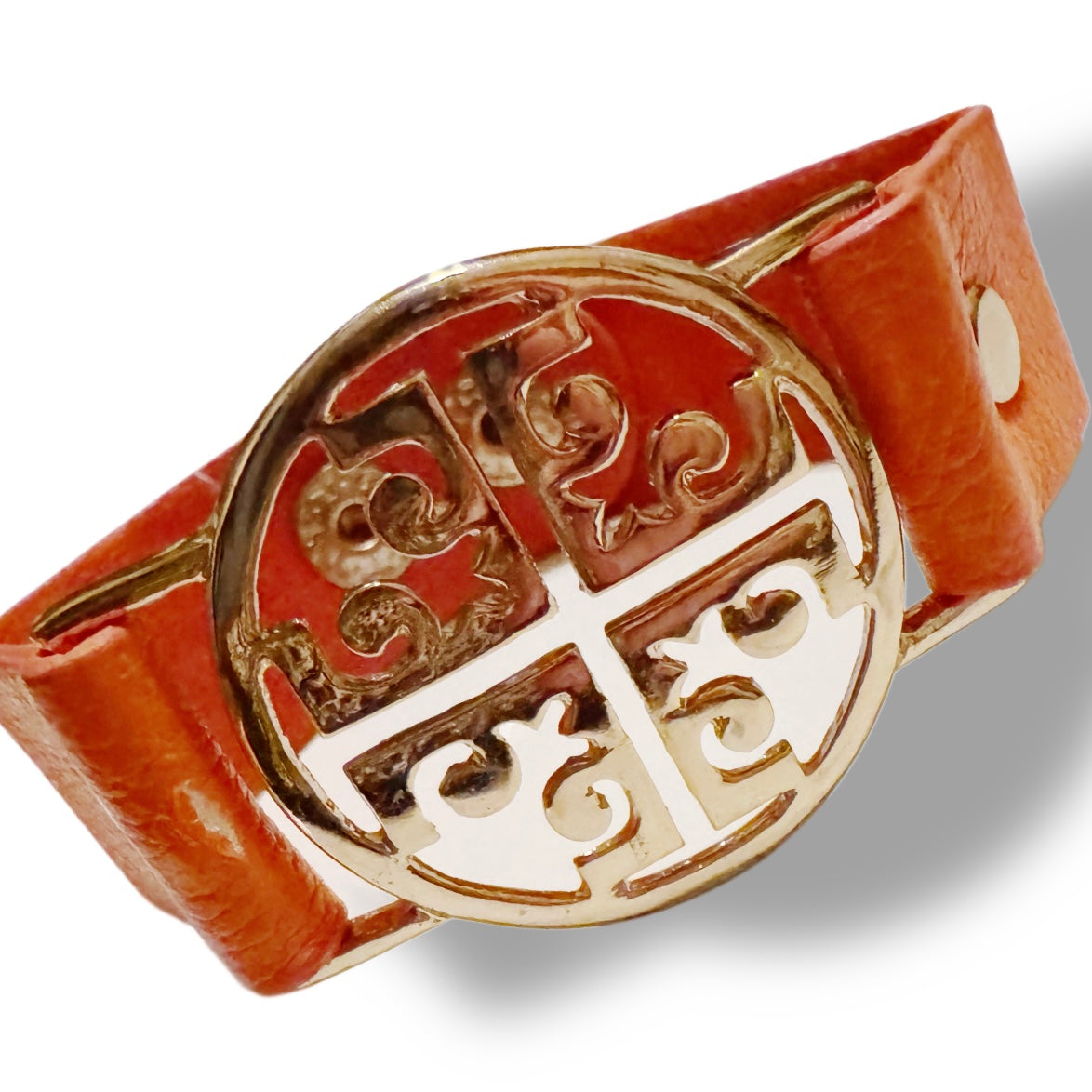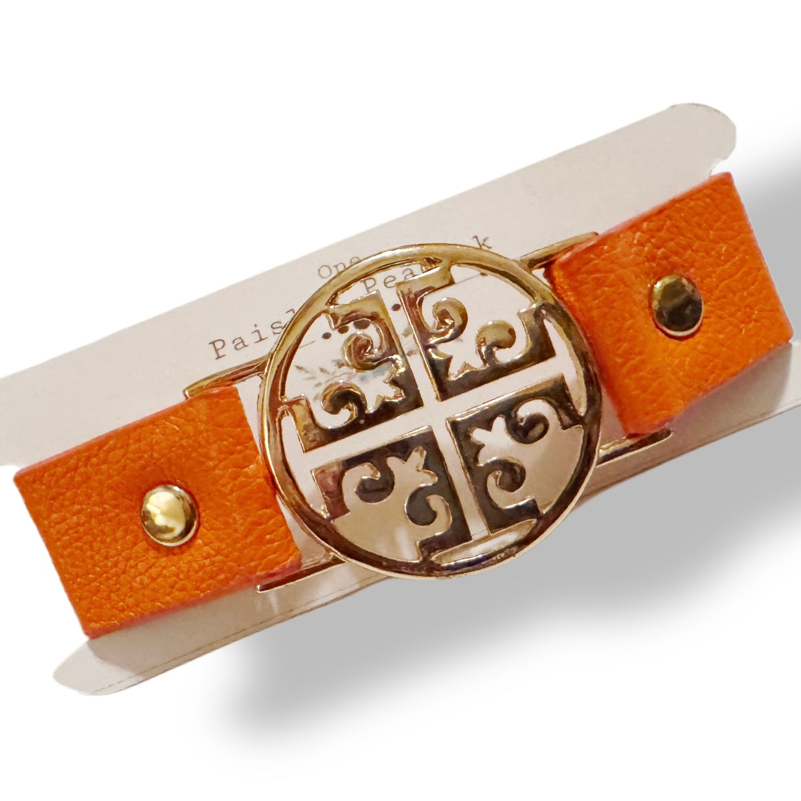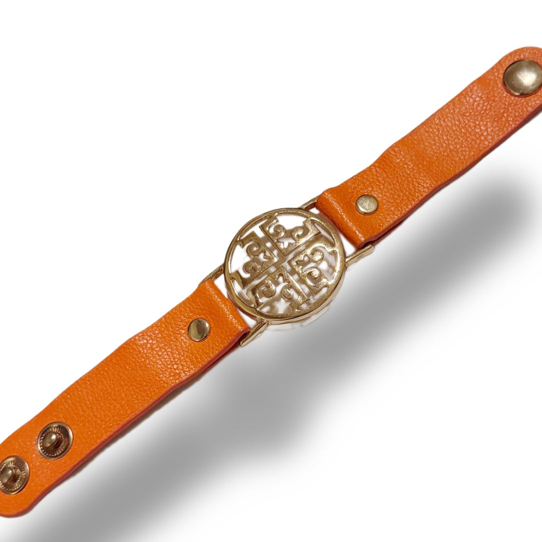 Designer Inspired Orange band bracelet. Gold tone charm on a imitation leather snap band.